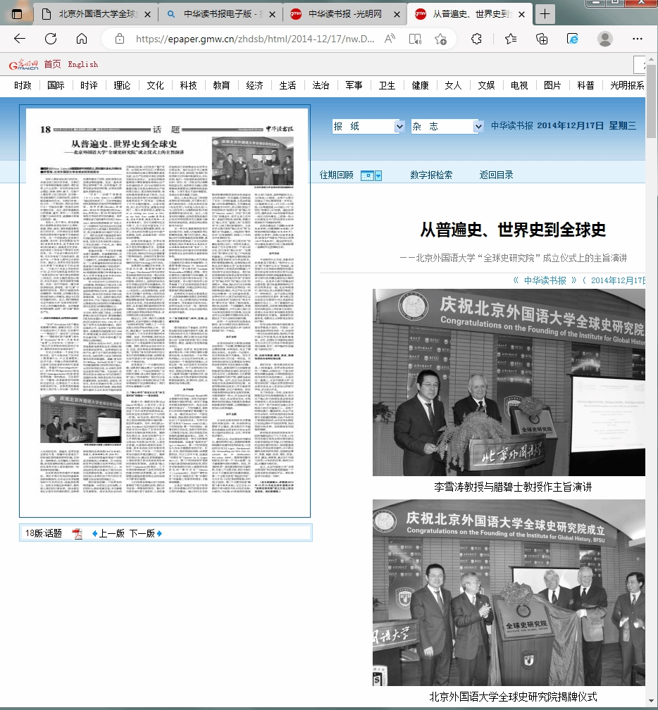 2014年12月17日,当日出版的《中华读书报》在第18 版话题上,整版全文刊载了德国国家科学院院士腊碧士(Alfons Labisch)教授和我校全球史研究院院长李雪涛教授在成立仪式上的主旨演讲《从普遍史、世界史到全球史》。全文共分为四部分:一、历史中的普遍史、世界史和全球史;二、轴心时代的定义以及多元现代性的概念理论规范;三、多元现代性:时间、空间、主题和方法;四、总结与展望:翻译、语言、原典性研究与各种迁移过程。