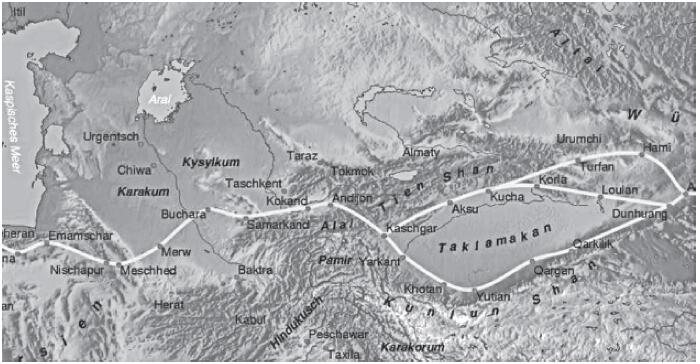 找到普遍问题、具体时期和具体的调查对象以后,考古证据出现的地点就需要界定。在东西方之间,有很多著名的路线,后来被简单标记为“丝绸之路”。我们至少可以从中分辨出四条不同的 线路: