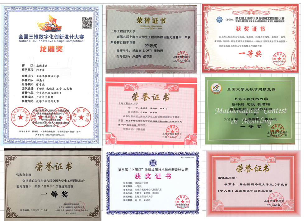 近三年来,本系教师在指导全国周培源大学生力学竞赛、全国大学生工程训练综合能力竞赛、机械工程创新大赛、数学建模、三维建模、上图杯、上海市大学生力学竞赛等学科竞赛中,获全国一等奖4项,二等奖1项,三等奖7项;上海市特等13项,一等奖30项,二等奖120项,优秀组织奖6项。“构建一体两翼人才培养新模式,提升机械类本科学生创新实践能力”获得2017年上海市教学成果奖2等奖,《材料力学》、《简明工程力学》等教材获2015年上海市优秀教材奖。