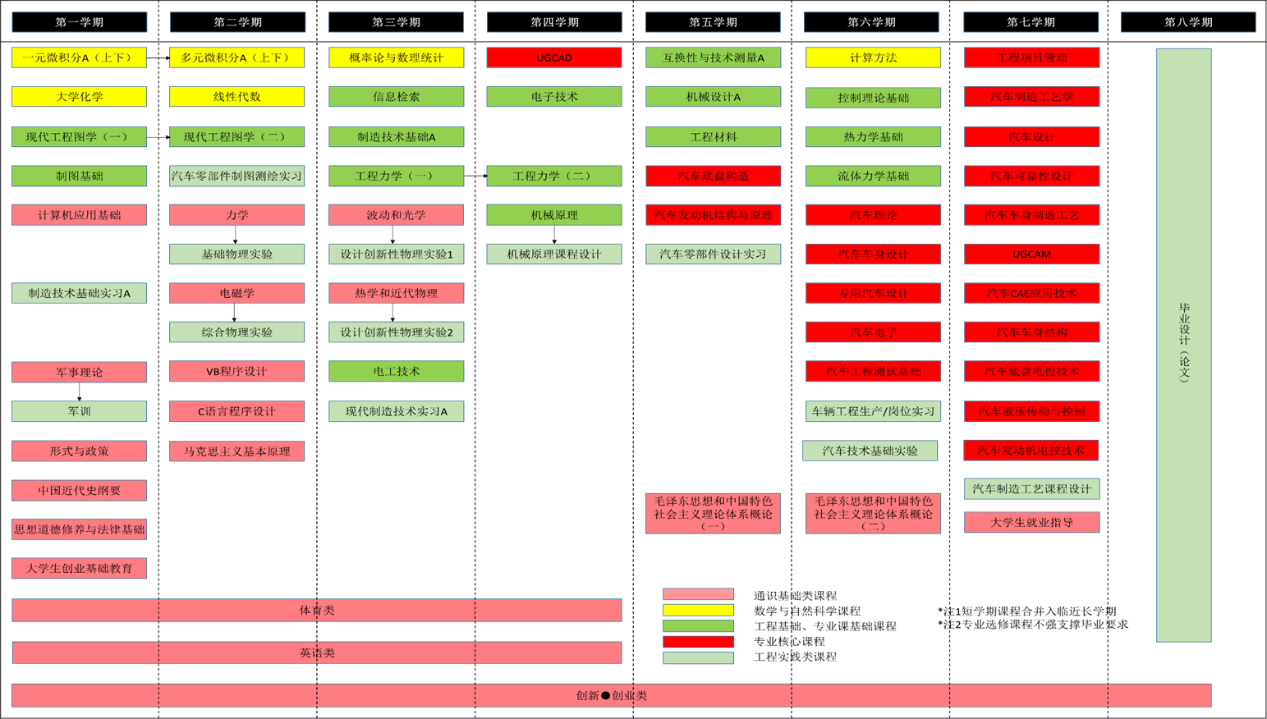 毕业要求:(1)工程知识:能够将数学、自然科学、工程基础和专业知识用于解决车辆工程中的复杂工程问题。(2)问题分析:能够应用数学、自然科学和工程科学的基本原理,识别、表达、并通过文献研究分析车辆工程中的复杂工程问题,以获得有效结论。(3)设计/开发解决方案:能够设计针对车辆工程中的复杂工程问题的解决方案,设计满足汽车产品需求的系统及零部件、制造工艺、测试流程,并能够在设计环节中体现创新意识,考虑社会、健康、安全、法律、文化以及环境等因素。(4)研究:能够基于科学原理并采用科学方法对车辆工程中的复杂工程问题进行研究,包括设计实验、分析与解释数据、并通过信息综合得到合理有效的结论。(5)使用现代工具:能够针对车辆工程中的复杂工程问题,开发、选择与使用恰当的技术、资源、现代工程工具和信息技术工具,包括对上述工程问题的预测与模拟,并能够理解其局限性。(6)工程与社会:能够基于工程相关背景知识进行合理分析,评价车辆工程中的复杂工程解决方案对社会、健康、安全、法律以及文化的影响,并理解应承担的责任。(7)环境和可持续发展:能够理解和评价针对车辆工程中的复杂工程问题的专业工程实践对环境、社会可持续发展的影响。(8)职业规范:具有人文社会科学素养、社会责任感,能够在车辆工程实践中理解并遵守工程职业道德和规范,履行责任。(9)个人和团队:能够在多学科背景下的团队中承担个体、团队成员以及负责人的角色。(10)沟通:能够就车辆工程中的复杂工程问题与业界同行及社会公众进行有效沟通和交流,包括撰写报告和设计文稿、陈述发言、清晰表达或回应指令。并具备一定的国际视野,能够在跨文化背景下进行沟通和交流。(11)项目管理:理解并掌握工程管理原理与经济决策方法,并能在多学科环境中应用。(12)终身学习:具有自主学习和终身学习的意识,有不断学习和适应发展的能力。